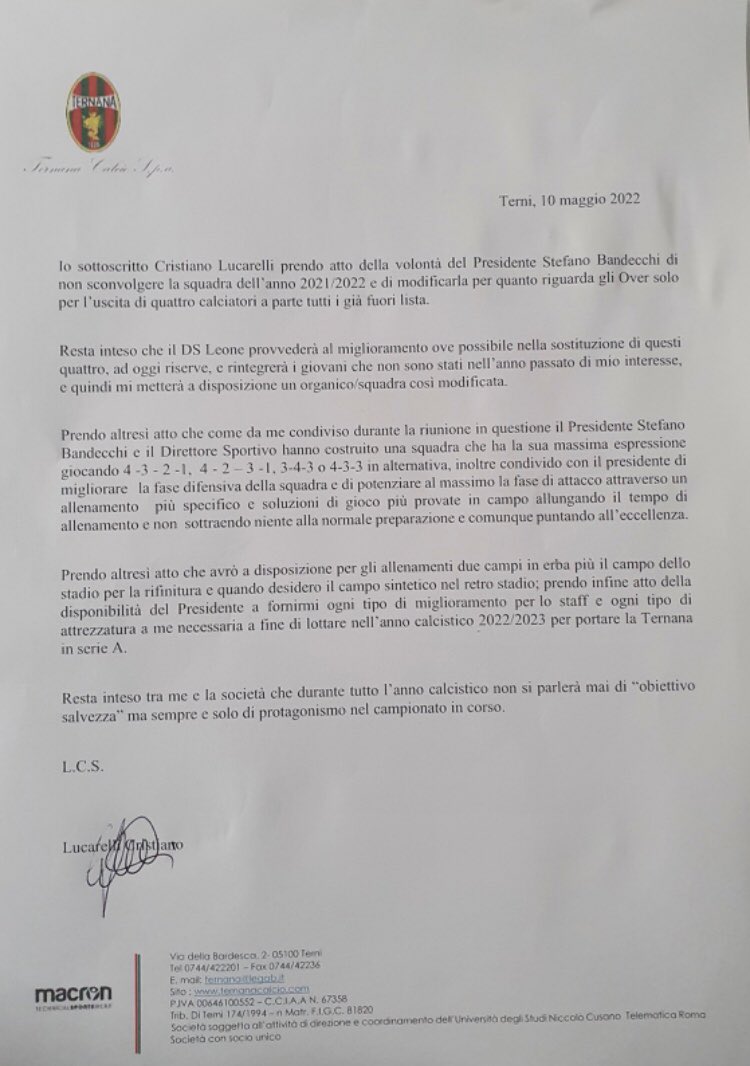 Lettera ad un mister di calcio. Eccellenza Campania 2022/23, ecco il regolamento completo Play Off e ... PUBBLICITÀ. NAPOLI. Nella serata di ieri il Consiglio Direttivo della Lega Nazionale Dilettanti Campania ha varato il regolamento ufficiale per i Play Off e Play Out del campionato d' Eccellenza Campania 2022/23. Ecco di seguito tutte le info necessarie per i club: Blog: Lettera a Simone. Errare è umano, ma perseverare... Quindi, caro Simone, il mio umilissimo consiglio a chi ha fatto giocare bene l'Inter come nessuno dei tre mister sopracitati, é quello di tornare a farci divertire perché è questo che ti farà amare... Fine della favola, mister D'Onofrio saluta la Valceresio: "È stato ... " La lettera che ho scritto racchiude tante cose - prosegue il mister - ma tutto era impossibile. Sulla carta ho allenato questa squadra cinque anni, anche se poi le stagioni intere sono state due, nella prima sono subentrato, le altre ci ha pensato il covid a spezzarle, eppure questi cinque anni sono così pieni che è come se fossi qui da sempre. Cessione Sampdoria, lettera del mediatore di Al Thani: "Pronti all ... Arrivano novità sul fronte cessione del club. Redazione ITASportPress. 20 settembre. Ci sono novità per la cessione della Sampdoria. La conferma è arrivata in una recente lettera mandata all' Ansa da parte di un mediatore svizzero di al Thani, membro della famiglia regnante del Qatar. Commenta per primo. "La mail di conferma firmata da un ...