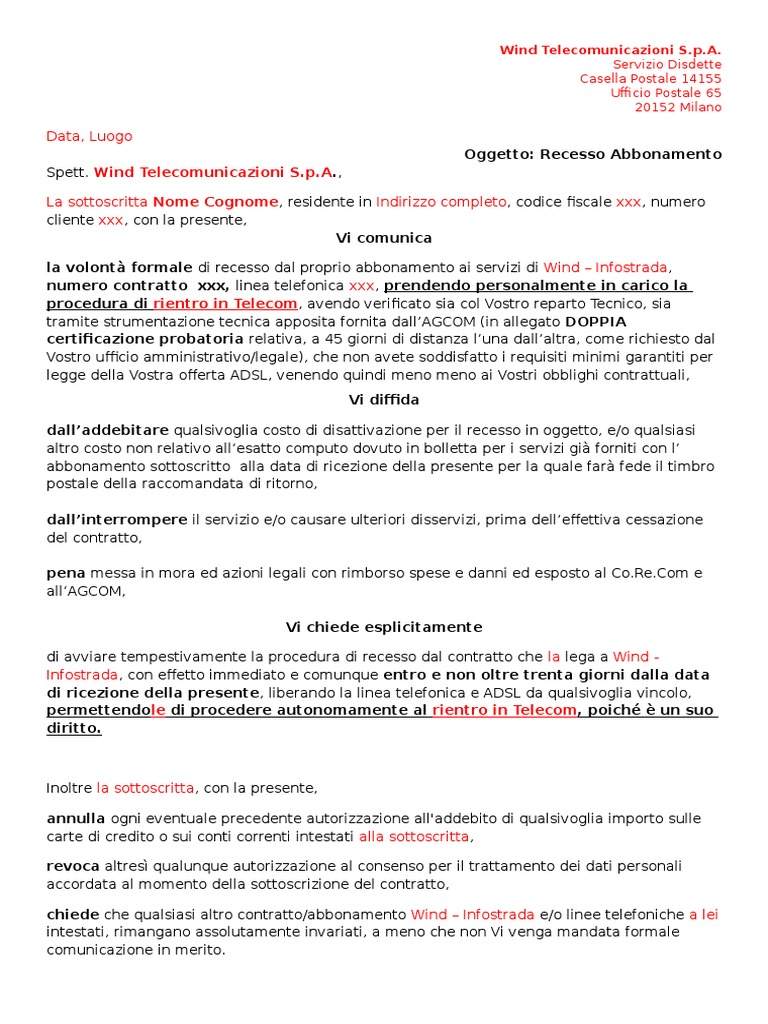 0 Response to "45 lettera disdetta contratto wind infostrada"